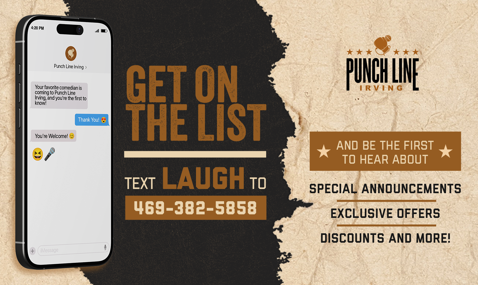Text "LAUGH" to (469) 382-5858 to join.